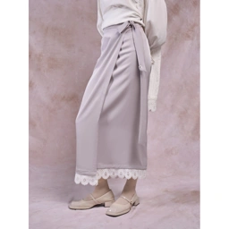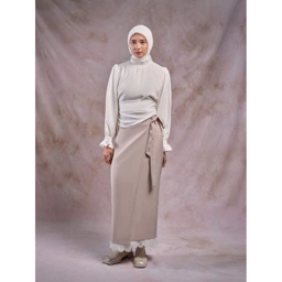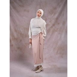 Rok lilit wanita yang anggun untuk Hari Raya, hadir dengan tali adjustable yang menyesuaikan bentuk pinggang dan hiasan renda di bagian bawah. Rok ini fleksibel digunakan sebagai bawahan atau apron skirt untuk layering yang stylish.