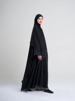 Outer kaftan dengan bahan satin yang lembut, berkilau elegan, dan dihiasi bordir dari lengan hingga belakang leher. Material flowy yang nyaman, cocok untuk traveling, haji, dan umroh.